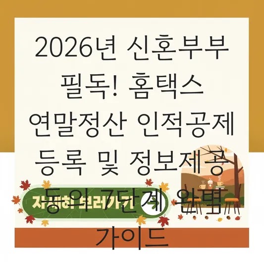 신혼부부 여러분, 이번 연말정산부터는 홈택스 인적공제 등록을 단순히 '서류 처리'로 보지 마시고, '효율적인 재무 설계'의 첫걸음이라고 생각해보세요. 지금 바로 배우자와 함께 홈택스에 접속하여 자료제공 동의를 신청하고, 2026년 연말정산에서 최대의 혜택을 누리세요.
